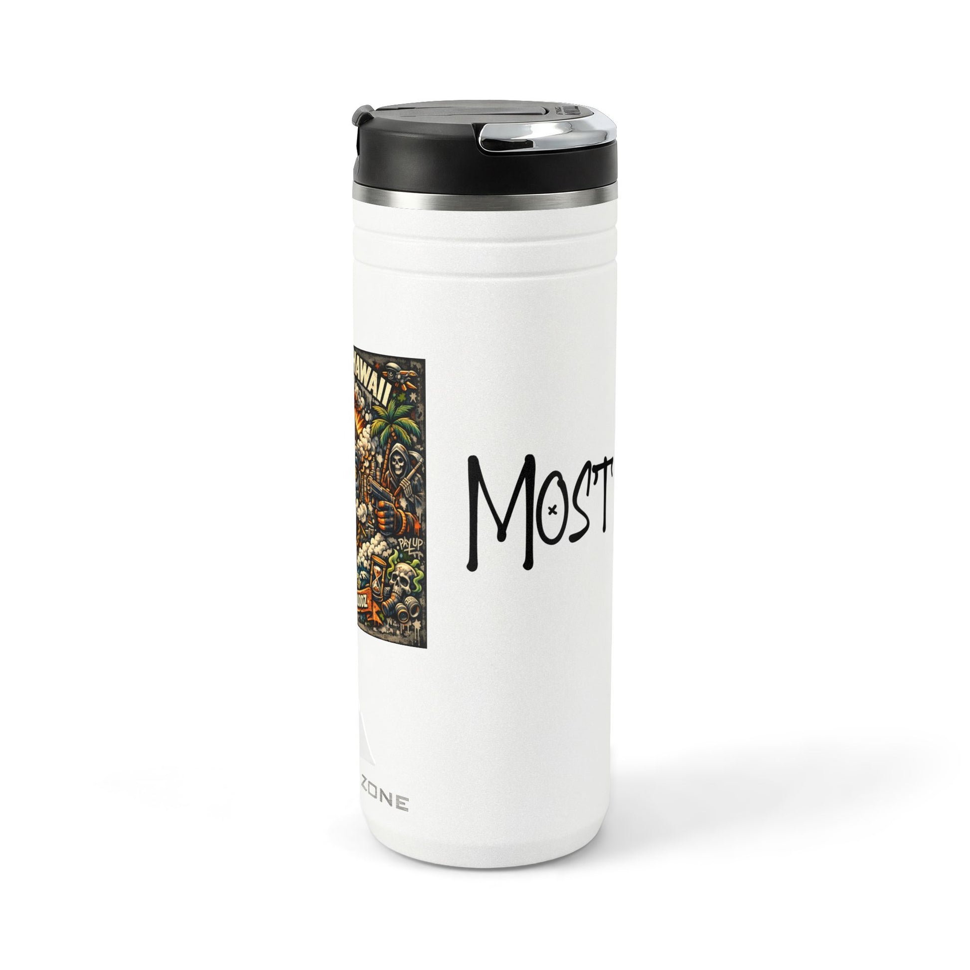 This 24oz stainless steel tumbler brings island attitude to your everyday routine. Solid 18/8 construction and double-wall insulation hold cold drinks for up to 24 hours and keep hot beverages warm for at least 8. The screw-on lid flips up to reveal a built-in straw for easy sips on the move, and the powder-coated, condensation-free finish resists scratches and fading so the artwork stays bold. It slips into most cupholders and measures 8.82" tall by 3.07" wide — a dependable companion for long drives, surf-side sessions, or late-night studio hours. The design adds a gritty, tropical edge that reads like a lived-in sticker plastered on your gear, turning a practical tumbler into a statement piece that travels with you.